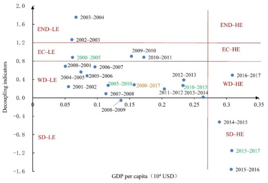 During stage 4 (2015–2017), the two-dimensional decoupling state changed from WD-LE to SD-HE (Figure 9). The GDP per capita was 0.31 × 104 USD and was bigger than the threshold value of GDP per capita. The decoupling indicator decreased to −1.15 and the average annual growth rate of CO2 emissions decreased to 1.67%. This could be explained by the fact that the total amount of energy consumption was controlled, and the technology of enterprise production was strengthened to further improve the energy efficiency of Gansu. As a result, CO2 emissions intensity and energy intensity have decreased to 24.35 t/104 USD and 9.55 tsce/104 USD during this stage, respectively. The decoupling status was SD-HE in this stage, but this didn’t mean that the economic development has reached the high-level stage and the decoupling state has reached strong decoupling in Gansu because it must take a long time to achieve SD-HE.
