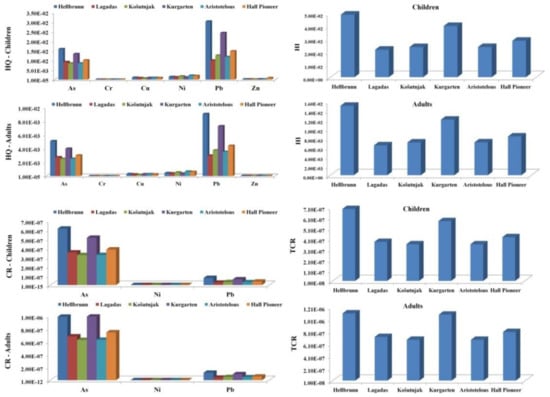 - Baltas, H.; Sirin, M.; Gokbayrak, E.; Ozcelik, A.E. A case study on pollution and a human health risk assessment of heavy metals in agricultural soils around Sinop province, Turkey. Chemosphere 2020, 241, 125015. [Google Scholar] [CrossRef] [PubMed]