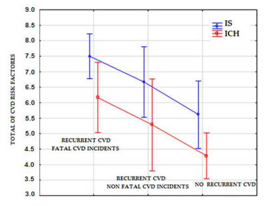 The values of distribution of the total risk factors for CVD were observed to be higher for the post-IS group than for the post-ICH group (Figure 2). In both groups, the greatest values of distribution of risk factors for CVD were observed for patients following a fatal recurrent CVD incident, whilst the lowest values were for patients who had no recurrent CVD incidents.