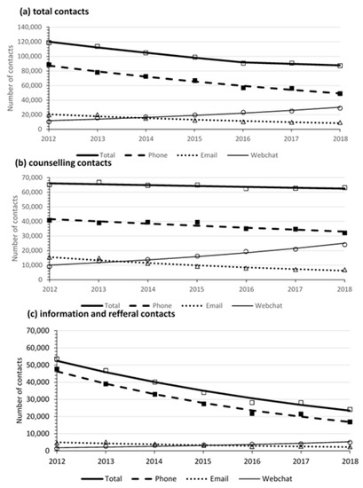 The following are available online at https://www.mdpi.com/article/10.3390/ijerph18116024/s1, Table S1: Descriptive statistics of the duration (in minutes) of phone counselling (n = 260–513) and information and referral (n = 207,113) contacts; Table S2: Descriptive statistics of the duration (in minutes) of webchat counselling (n = 118,332) and information and referral (n = 24,488) contacts; Table S3: Counselling concern trends across each medium in 2012–2018 (total n = 449,814); Table S4: Number and percentage of contacts reporting at least one problem in each problem group across gender and age groups (n = 449,814).