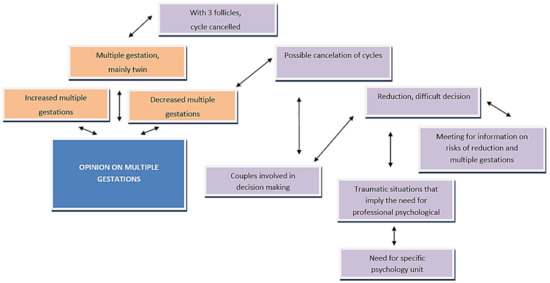 As for ART, reference is made to the need for a specific unit of psychology, as traumatic situations occur during the procedure that require psychological support. The main views of participants regarding the number of multiple gestations in recent years are illustrated in a cognitive map below.