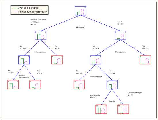 The CART analysis. The dependent variable is the restoration of the sinus rhythm. The independent variables include sex (male or female); age <65 years or ≥65 years; AF duration since onset of 0–43 h vs. >43 h or unknown; AF duration 0–6 h vs. >6 h or unknown; University Hospital vs. Copernicus Memorial Hospital; pandemic period vs. non-pandemic period; electrical cardioversion versus chemical cardioversion using Phenazolinum, Amiodarone, Propafenone, or beta blockers.
