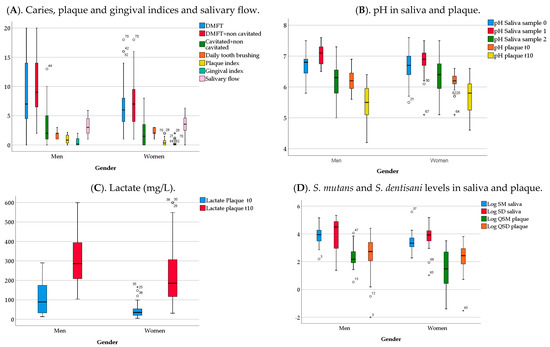 Clinical, biochemical and microbiological variables by gender. The graphs show medians and IQR values for the different variables. (A) DMFT = ICDAS codes 3–6 + restoration ICDAS codes 7 and 8 + missing teeth due to caries + filled teeth due to caries. DMFT with non-cavitated lesions = DMFT + ICDAS codes 1–6 + restoration ICDAS codes 7 and 8. (B) pH_saliva (sample 0) = basal salivary pH. pH_saliva (sample 1) = salivary pH after tooth-brushing. pH_saliva (sample 2) = salivary pH after sugar rinse. pH plaque t0 = plaque pH before sugar rinse. pH plaque t10 = plaque pH after sugar rinse. (C) Lactate plaque t0 = plaque lactate levels before sugar rinse (mg/L). Lactate plaque t10 = plaque lactate levels after sugar rinse (mg/L). (D) Log SM saliva = Log10 transformation of normalized CFUs/mL of S. mutans in saliva, Log SD saliva = Log10 transformation of normalized CFUs/mL of S. dentisani in saliva. Log QSM plaque = Log10 transformation of normalized CFUs/ng of S. mutans in plaque, Log QSD plaque = Log10 transformation of normalized CFUs/ng of S. dentisani in plaque. The expected loss in statistical power due to the difference in male:female ratio is <0.05.