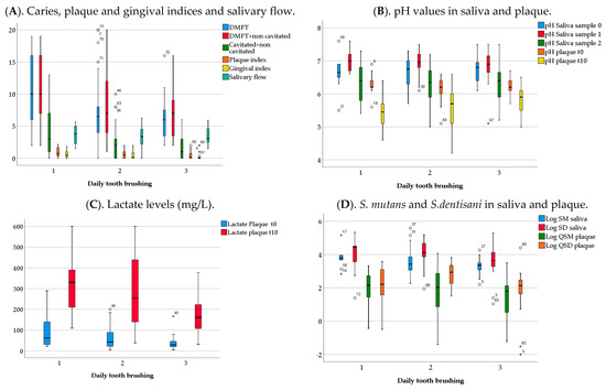 Clinical, biochemical and microbiological variables by daily tooth-brushing. Graphs show medians and IQR values for the different variables. (A) DMFT = ICDAS codes 3–6 + restoration ICDAS codes 7 and 8 + missing teeth due to caries + filled teeth due to caries. DMFT with non-cavitated lesions = DMFT + ICDAS codes 1–6 + restoration ICDAS codes 7 and 8. (B) pH_saliva (sample 0) = basal salivary pH. pH_saliva (sample 1) = salivary pH after tooth-brushing. pH_saliva (sample 2) = salivary pH after sugar rinse. pH plaque t0 = plaque pH before sugar rinse. pH plaque t10 = plaque pH after sugar rinse. (C) Lactate plaque t0 = plaque lactate levels before sugar rinse (mg/L). Lactate plaque t10 = plaque lactate levels after sugar rinse (mg/L). (D) Log SM saliva = Log10 transformation of normalized CFUs/mL of S. mutans in saliva, Log SD saliva= Log10 transformation of normalized CFUs/mL of S. dentisani in saliva. Log QSM plaque = Log10 transformation of normalized CFUs/ng of S. mutans in plaque, Log QSD plaque = Log10 transformation of normalized CFUs/ng of S. dentisani in plaque.