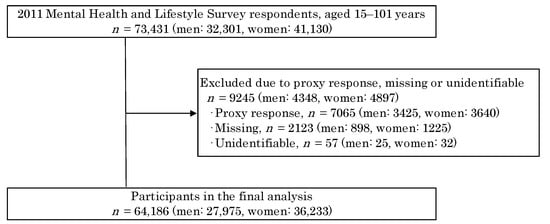 In this cross-sectional study, the Mental Health and Lifestyle Survey was conducted as part of the Fukushima Prefecture Health Care Survey among 64,186 participants who were born on or before 1 April 1995, i.e., those who were approximately 16 years old or older at the time of the Great East Japan Earthquake. The details of this survey are described in previous studies [2,16]. Briefly, the survey was conducted by sending self-administered questionnaires to approximately 210,000 people who were registered as residents in evacuation areas at the time of the earthquake and divided into five age groups (0–3 years old, 4–6 years old, elementary school students, junior high school students, and people approximately 16 years old or older) according to their current mental and physical health, lifestyle, and living conditions. The survey was conducted from 18 January 2012, to 31 October 2012, approximately 10 months after the earthquake occurred on 11 March 2011. A total of 73,431 out of 180,604 people aged approximately 16 years and above responded (response rate, 40.7%) [17], of which proxy responses (n = 9245) were excluded. Of the respondents, 64,186 evacuees aged 15–101 years (mean age: 55.2 years) were included in the analysis (Figure 1).