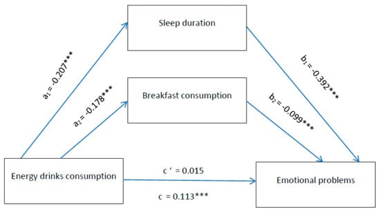 Mediation by sleep duration and breakfast consumption of the relation between EDs and emotional problems. Notes: *** p < 0.001. All presented effects are unstandardised; an is the effect of ED consumption on mediators; bn is the effect of mediators on emotional problems; c’ is the direct effect of ED consumption on emotional problems, and c is the total effect of ED consumption on emotional problems.