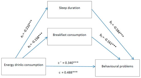 Mediation by sleep duration and breakfast consumption of the relation between EDs and behavioural problems. Notes: *** p < 0.001. All presented effects are unstandardised; an is the effect of ED consumption on mediators; bn is effect of mediators on behavioural problems; c’ is the direct effect of ED consumption on behavioural problems, and c is the total effect of ED consumption on behavioural problems.