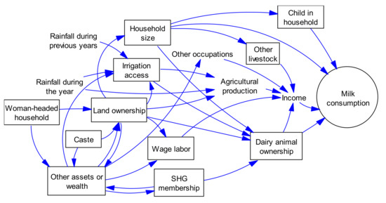 Crude odds ratios (ORs) and 95% CIs were calculated for describing the relationship between household milk consumption (the main outcome; binary variable) and a set of pre-determined covariates (i.e., ownership of dairy animal, household size, sex of household head, existence of children in household, caste (scheduled caste or SC, scheduled tribe or ST and other; with SC and ST considered as marginalized groups in most regions in India), land ownership, access to irrigation, self-help group (SHG) membership and a dummy variable for wage labor as main income source. Household income (self-reported) data were available but not used as a covariate in our analysis because of high potential for measurement errors, and literature from India suggesting that income was an unsuitable predictor of nutrition in rural areas [11]. Several included covariates are proxies for income, for instance, land ownership, access to irrigation, and ownership of motorized vehicles. The covariates were based on a hypothesized causal model of household milk consumption in rural areas in southern India, as ascertained from literature [5,7,8,11,12,26] and knowledge of the local context (Figure 1).
