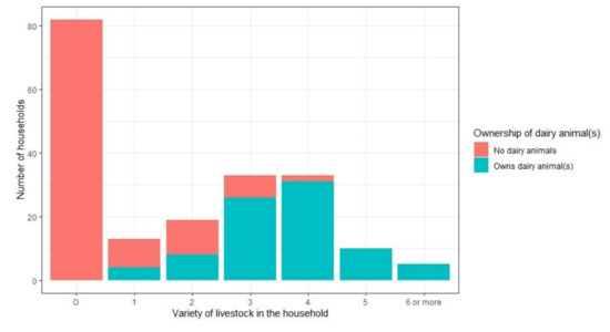 Details on ownership of livestock in the study population are shown in Figure 2. Those owning dairy animals (local variety cows, buffaloes, and/or high-yielding variety cows) more often had greater variety of livestock (including chicken, goats, sheep, oxen, and/or calves).
