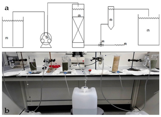 (a) Outline of the system used to perform column tests. (1) Reservoir; (2) peristaltic pump; (3) column; (4) three-way valve; (5) container controller of the liquid level in the column; (6) sampling; (7) collector output from the column. (b) Photo of the laboratory apparatus used for column tests.