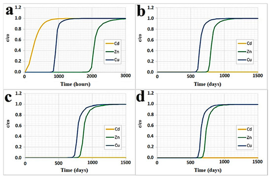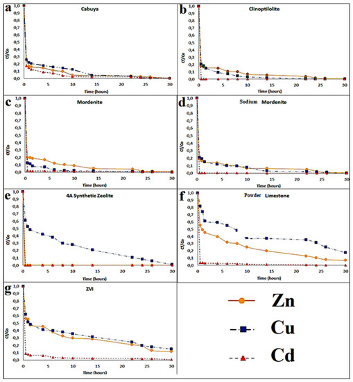 Figure 3, Figure 4 and Figure 5, respectively, depict the results of the column tests for Zn, Cu and Cd and for the four reactive materials considered. The reported results mark a trend and show that there is a higher adsorption of metals, in contact with the different reactive media, in the early contact times. The adsorption decreases with increasing time, without a significant change in the amount of adsorbed metal ions. This plateau represents saturation of the active sites available on the reactive medium samples for interaction with metal ions [26].