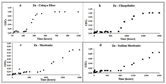 Variation of Zn concentration over time, in the column tests, for the following reactive materials: (a) cabuya fiber; (b) clinoptilolite zeolite; (c) mordenite zeolite; (d) sodium mordenite zeolite. The experimental conditions in ranges were: dynamic fluid, temperature: 26–28 °C and pH: 7–8.3.