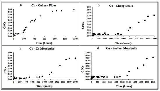 Variation of Cu concentration over time, in the column tests, for the following reactive materials: (a) cabuya fiber; (b) clinoptilolite zeolite; (c) mordenite zeolite; (d) sodium mordenite zeolite. The experimental conditions in ranges were: dynamic fluid, temperature: 25–27 °C and pH: 7–8.6.