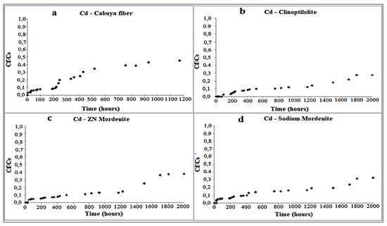 Variation of Cd concentration over time, in the column tests, for the following reactive materials: (a) cabuya fiber; (b) clinoptilolite zeolite; (c) mordenite zeolite; (d) sodium mordenite zeolite. The experimental conditions in ranges were: dynamic fluid, temperature: 26–28 °C and pH: 7.4–8.8.