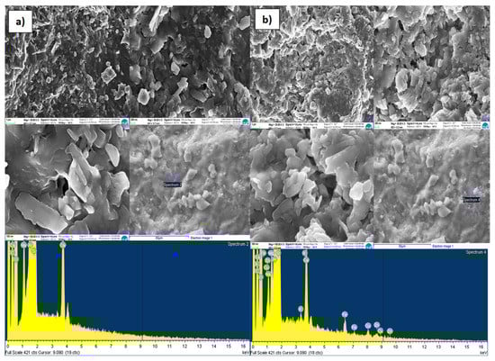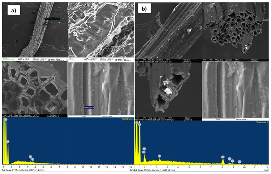 The results of the FESEM and EDX analyzes made, to evaluate the adsorption capacity of reactive materials considered, at the inlet and outlet of the column, are shown in Figure 6, Figure 7, Figure 8 and Figure 9a,b, respectively, related to each reactive material. The FESEM analysis of the cabuya fiber (Figure 6) allowed to determine the size of the fiber bundles, with an indicative value of 232.9 μm, also highlighting a typical internal morphology with empty spaces.
