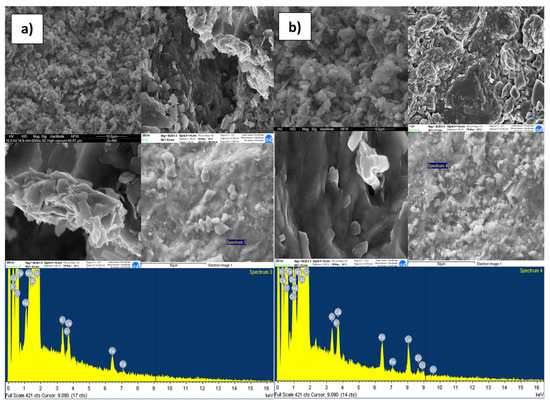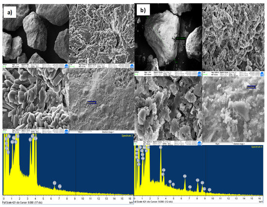 The concentrations of these metals were determined by ICP-MS (inductively coupled plasma mass spectrometry—ELAN®6000 from Perkin Elmer, Waltham, MA-USA). Before starting each test, we verified that the density of the reactive media has a compaction degree compatible with the water flow within a real aquifer and that the velocity filtration assume a value adequate to guarantee a contact time between the contaminated solution and the reagent medium, such as to ensure a complete process of contaminant degradation. Each column was filled with the corresponding reactive material, with the density values reported in Table 1. Each column test was carried out using a mixture of zinc, copper and cadmium as main transition metals ion. Contaminated solution was set to flow, with the assigned concentration of the considered transition metals ion, from the top to the bottom of the column through a peristaltic pump connected by tygon tubes with the column and various containers (see Figure 1). During the test, samples were collected at fixed times at the exit of the column to obtain the variation trend of the concentration and evaluate the removal capacity of the reactive material over time. Initially, samples were collected twice a day; subsequently, the sampling frequency was reduced to once every two days and, at the end, to once a week. Furthermore, the pH of each sample was also measured as previously specified. Furthermore, to evaluate the adsorption capacity of each reactive material considered at the inlet and outlet of the column all reactive media were further characterized by field emission scanning electron microscopy (FESEM) (Huntington Beach-CA-USA) and energy dispersive X-ray analysis (EDX) to obtain high-resolution images of the surfaces, and therefore morphological information. For this purpose, the electron microscope model FESEM, SHIMADZU (NEON 40) was used.