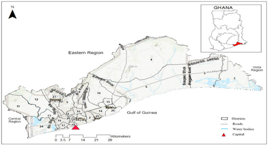 - Ghana Health Service. Greater Accra Regional Health Directorate at a Glance; Ghana Health Service: Accra, Ghana, 2019. [Google Scholar]
