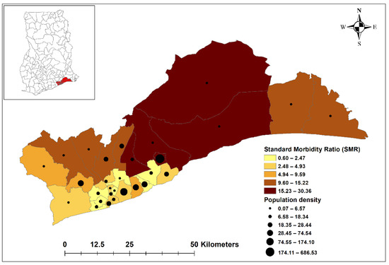 - Standardized morbidity ratios (SMRs) per district were analyzed using the following formula:where Y denotes the total SMR in district i, and O and E are, respectively, the total number of the observed and expected malaria cases in district i across the study period. The expected number (E) was calculated by multiplying the regional malaria incidence by the average population for each district over the study period.