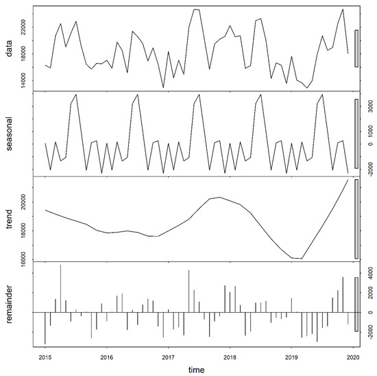 - Cleveland, R.B.; Cleveland, W.S.; McRae, J.E.; Terpenning, I. STL: A seasonal-trend decomposition. J. Off. Stat. 1990, 6, 3–73. [Google Scholar]