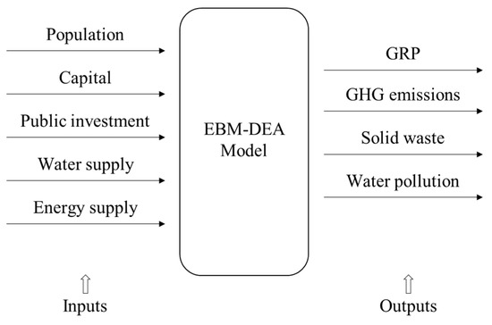 EBM models are used for the eco-efficiency analysis of the 28 Russian cities along the NSR in this study. The variables used in the models include population, capital, public investment, water supply, energy supply, gross regional product (GRP), GHG emissions, solid waste, and water pollution. The first five of the abovementioned variables are used as the inputs of the EBM models, and the rest are taken as the associated outputs. Figure 1 exhibits such a model framework. These variables are measured in the units displayed in Table 1. Annual data on these variables for 28 Russian cities along the NSR in the period from 2010 to 2019 are obtained from the Russian Federal Statistics Service. These data are used as inputs and outputs of the models constructed in this study. The descriptive statistics of these inputs and outputs for all the years are exhibited in Table 2.