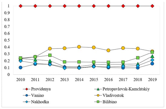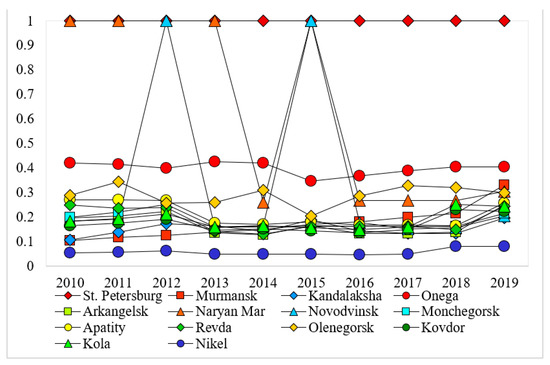 The eco-efficiency scores of the cities along the NSR are generated based on the EBM model, which are exhibited in Table 3. As shown in Table 3, St. Petersburg, Provideniya, Nadym, N. Urengoy, and Noyabrsk are eco-efficient across all the years from 2010 to 2019. Onega is moderately eco-efficient, and the eco-efficiency scores range between 0.345 and 0.420. The other cities in Table 3 have relatively low levels of eco-efficiency. From the perspective of the temporal pattern of eco-efficiency scores (those of the cities along the western, central, and eastern section of the NSR are displayed in Figure 2, Figure 3 and Figure 4, respectively), it is evident that the scores of most cities remain stable or fluctuate slightly around a certain level. The exceptions are Naryan-Mar, Novodvinsk, and Salekhard, which all experience steady rise and sharp decline.