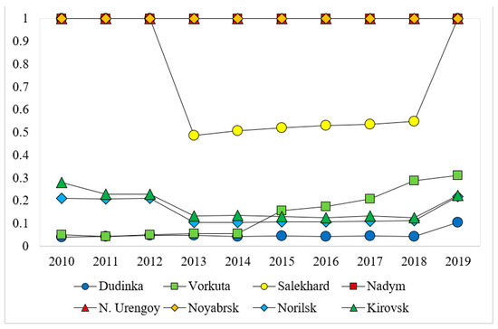 Regarding the excesses of negative outputs (denoted by “SB” in Table 4), including GHG, solid waste, and water pollution, more than half of the cities need to have a reduction of more than 40% on these outputs to achieve eco-efficiency. The ecology of the Russian Arctic is fragile, and the impact of environmental damage is greater than that in other regions. The circular economy will become the sustainable development solution for Russian Arctic cities in the future. It can reduce the emissions of various forms of pollution and waste, and ensure the sustainable development of the region as much as possible [54]. To maintain the balance between economic development and Arctic environmental protection, the authorities need to continue conducting a major clean-up of the environmental damage in the Russian Arctic areas which was accumulated through the economic activities in the past decades. They also need to develop a system of specially protected natural territories and reserves in the Russian Arctic for better environmental protection. Education and science centers need to be established in the Russian cities along the NSR to ensure the development of fundamental research and help address the practical tasks of Arctic sustainable development. International research teams and alliances of high-tech companies should be encouraged to take part in joint research projects in the fields such as shipbuilding, navigation safety, environmental protection, oil, gas, and mineral production, and marine bioresources harvesting.
