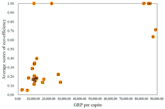 Regarding the spatial distribution of the eco-efficiency of these cities (shown in Figure 5), it can be seen that the cities along the central section of the NSR are generally more eco-efficient than those along the eastern and western section. This regional disparity in eco-efficiency exhibits a similar pattern to the GRPs per capita of the cities. As can be seen from Figure 6, the cities with higher GRPs per capita also have higher eco-efficiency scores with the exception of St. Petersburg and Provideniya (denoted by “1” and “8”, respectively). A possible explanation for the association is based on natural resources, populations, and policies. The neighboring areas of the central section of the NSR containing rich reserve of natural resources such as oil and gas can generate relatively high GRPs, and the areas have small populations, which leads to comparatively high GRPs per capita. In addition, the Russian economy relies heavily on the export of natural resources, and the Russian government provides a strong support for the development of the energy industry. This all indicates that the authorities and related stakeholders can invest more resources in the fields such as capital, technology, and management to the cities along the eastern and western section, so as to make these cities use resources more efficiently and discharge fewer pollutants.