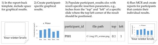 The report template contains the layout for each page of the individual report. Template design is at the discretion of the research team. Generally, templates contain generic information present in all reports (e.g., a description of common indoor pollution sources), blank space for graphical results, and placeholders for individualized numerical or text results. Placeholders are composed of (variable) bracketing characters (e.g., “{“and“}”) and a unique identifier for the result to be inserted (e.g., “{participant_name}”). The inserted text matches the format of each specific placeholder. Researchers prepare individual numerical, text, and graphical results using software of their choice; the research teams in the applications below used R [] and VBA. A Microsoft Excel workbook (e.g., participant_results.xlsx) is the container for all participant results, with worksheets for participant-specific numerical and text results (e.g., words, phrases, sentences), graphic results, and instructions for any special formatting characters (e.g., subscripts in chemical formulae). For numerical and text results, each worksheet row corresponds to results for an individual participant, with column headers corresponding to specific template placeholders and column cells representing individualized results to be inserted into the report-back template. Figure 1 provides an example of insertion of numerical results into an individual report and Figure 2 provides an example of insertion of graphical results. For the sheet of graphical results, each row corresponds to a single graphical result for a specific participant and contains the graphical result file path, the report-back page number, and the insertion parameters (e.g., changes to the image aspect ratio, distance from the top or side of the specified page).