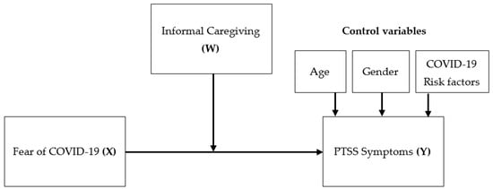 To test whether caregiving moderates the relationship between fear of COVID-19 (predictor variable) and PTSS symptoms (outcome variable), a simple moderation analysis was also conducted using PROCESS Macro Model 1 []. The conceptual model is shown in Figure 1. Variables that were significantly correlated with PTSS symptomatology, were included as covariates in moderation analysis. Post-hoc simple slope analyses were performed to estimate conditional effects of the moderator variable. The interaction effect (Fear of COVID-19 × Caregiving) was considered significant when 95% confidence intervals (CIs) did not include zero []. Bootstrapping resampling technique (with 10,000 replications) was used to estimate 95% CIs and continuous variables were mean centered to avoid potential multicollinearity effects []. The confidence level was set at 95%.