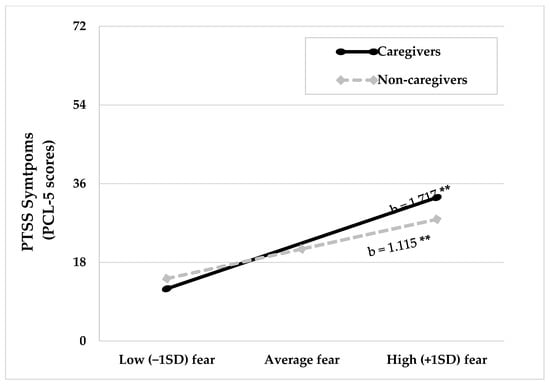 Plots and simple slopes for the significant moderation effect of caregiving. Caregiving moderates the relationship between fear of COVID-19 (displayed on the x-axis) and PTSS (displayed on the y-axis). Mean of fear of COVID-19 was 18.73 with a standard deviation of 6.08. Simple slope analyses were conducted at three levels of fear: low (one standard deviation below the mean), average (mean value of fear of COVID-19) and high (one standard deviation above the mean). Notes: b = unstandardized coefficients, ** p < 0.01.