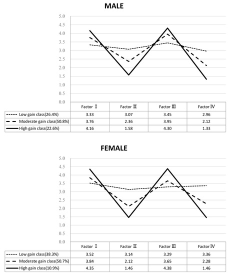 Second, when a man had multiple children, the likelihood of belonging to the high-gain class increased by a factor of 1.72. In women, the number of children was not significant. While men with multiple children perceive a higher level of work–family gains from psychological support from their spouse and children [41], women with multiple children or young children tend to perceive a higher level of work–family strains [42,43].