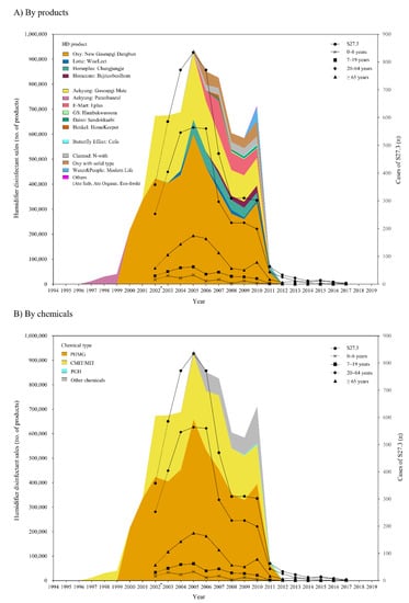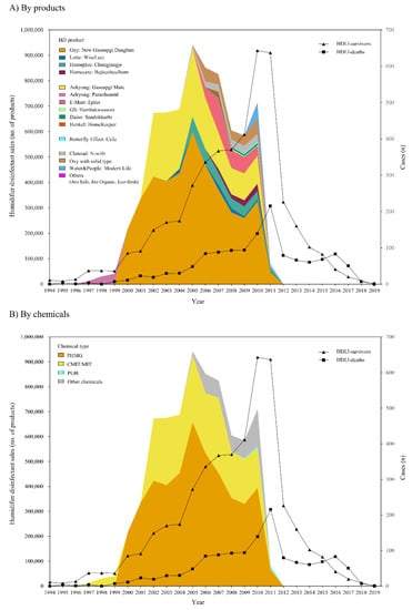 Moreover, annual HD sales were classified by four chemical types: PHMG (CAS number: 89697-78-9), CMIT/MIT (CAS number: 26172-55-5/2682-20-4), PGH (CAS number: 374572-91-5), and other chemicals; (1) PHMG chemicals include the products of Oxy Ssakssak New Gaseupgi Dangbun (Oxy; Oxy Reckitt Benckiser (RB) Korea, Seoul, Korea), Lotte WiseLect Gaseupgi Salgyunje (Lotte; Lotte Mart, Seoul, Korea), Homeplus Gaseupgi Chungjungje (Homeplus; Homeplus, Seoul, Korea), and Homecare Bejiteobeulhom Gaseupgi Cleanup (Homecare; Costco Korea, Gyeonggi, Korea); (2) CMIT/MIT chemicals include the products of Aekyung Gaseupgi Mate and Palanhaneul Malg-eun Gaseupgi (Aekyung; Aekyung, Seoul, Korea), E-Mart Eplus Gaseupgi Salgyunje (E-Mart; E-Mart, Seoul, Korea), GS Hambakwussom Gaseupgi Sejeongje (GS; GS Retail, Seoul, Korea), Daiso Sandokkaebi Gaseupgi Punisher (Daiso; Asung Daiso, Seoul, Korea), Henkel HomeKeeper Humidifier Sterilizer (Henkel; Henkel Homecare Korea, Seoul, Korea), and SK Yugong Gaseupgi Mate; (3) PGH chemicals include the products of Butterfly Effect Cefu Gaseupgi Salgyunje (Butterfly Effect; Butterfly Effect, Gyeonggi, Korea) and Ato Organic Gaseupgi Salgyunje (Ato Organic; Ato Organic, Gyeonggi, Korea); (4) other chemicals include the products of Clannad N-with (Clannad; Clannad, Gyeonggi, Korea), Oxy Ssakssak with solid type (Oxy with solid type), Oxy Gaseupgi Dangbun, LG 119 Gaseupgi segyunjegeo, Ato Safe Gaseupgi Chungjungje/Hangkyunje (Ato Safe; Ato Safe, Seoul, Korea), Eco-fresh Gaseupgi Hangkyunball (Eco-fresh; JnK Science, Seoul, Korea), and Water&People Modern Life Salgyunball (Water&People; Nutricare, Gyeonggi, Korea) [].