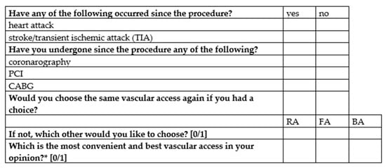 Roczniak, J.; Koziołek, W.; Piechocki, M.; Tokarek, T.; Surdacki, A.; Bartuś, S.; Chyrchel, M. Comparison of Access Site-Related Complications and Quality of Life in Patients after Invasive Cardiology Procedures According to the Use of Radial, Femoral, or Brachial Approach. Int. J. Environ. Res. Public Health 2021, 18, 6151. https://doi.org/10.3390/ijerph18116151