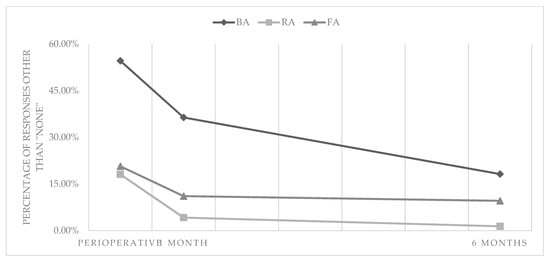 | Time Point | Type of Problems | BA (n = 11) | RA (n = 72) | FA (n = 63) | p Value |