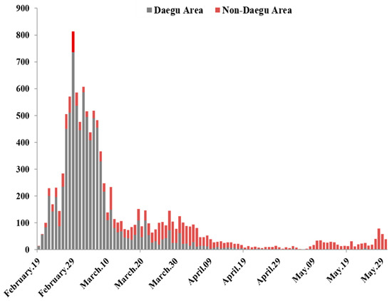 On 20 January 2020, the first confirmed case of COVID-19 was observed among the returnees to Korea who visited Wuhan, China. Thereafter, on 19 February, confirmed cases were reported from a religious group in the Daegu area (Gyeongbuk Province surrounding Daegu) and consequently on 23 February, the alert level in the region was raised to “highest” (level 4) [6]. As of 29 February 2020, the number of confirmed cases in the Daegu area accounted for 91% of all the confirmed cases in Korea (Korea Center for Disease Control and Prevention, KCDC [7]; Figure 1).
