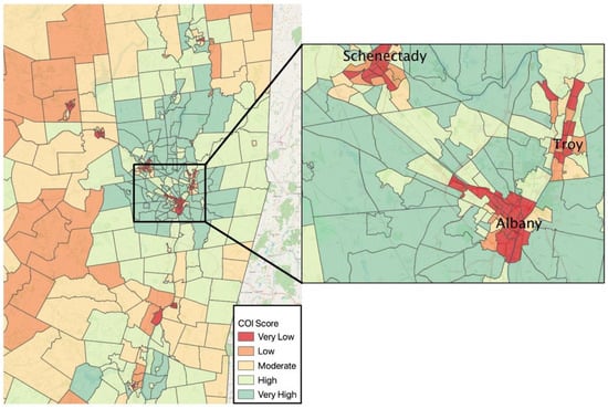 Maps of Child Opportunity Index (COI) scores by Census tract for the New York State Capital District. The left map includes the urban, suburban, and rural areas participants inhabited during pregnancy, as well as neighboring census tracts. All regional tracts were included so as to protect confidentiality of participants as some tracts included less than five people. Very low COI scores were heavily concentrated in urban areas, with low and moderate COI in surrounding rural regions, and very high COI concentrated in the suburbs of urban centers. The right map zooms in on the urban center of the Capital District, which encompasses the cities of Albany, Schenectady, and Troy, which is where the majority of participants lived.
