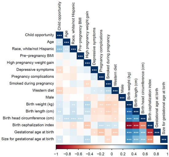 The bivariate associations between the study variables are listed in Figure 2. Overall, higher COI scores were significantly correlated with older maternal age, white/non-Hispanic race, fewer depressive symptoms during pregnancy, less adherence to a western diet during pregnancy, as well as higher birth weight, longer birth length, greater head circumference, and appropriate size for gestational age at birth. All maternal pregnancy health factors were significantly correlated with the infant outcomes; patterning was in the expected directions, with a greater maternal pregnancy risk associated associations between neighborhood level child opportunied with riskier infant outcomes.