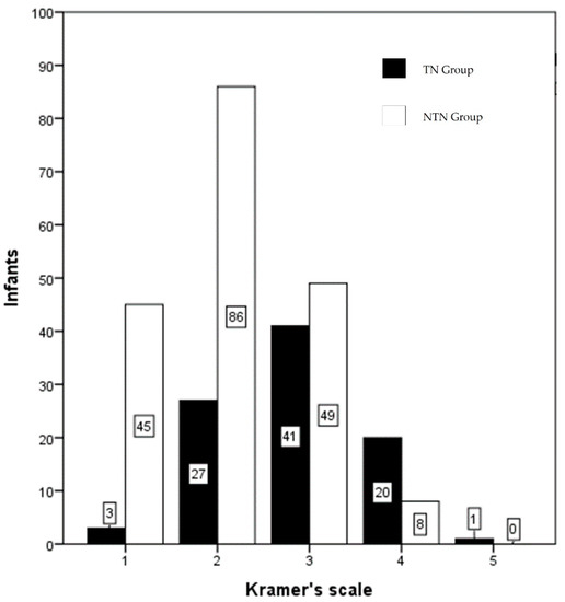 Number of infants needing phototherapy for each Kramer score. Black Bars infants who needed therapy (TN group); white bars infants where phototherapy was not indicated (NTN group).