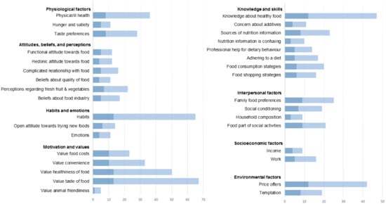 All interviews were audio-recorded and transcribed verbatim by a research assistant and a professional audio transcription company, and all personal identifying information was removed from the transcripts. Transcripts were imported in Atlas.ti (ATLAS.ti Scientific Development GmbH, Berlin, Germany). The process of coding was informed by the Qualitative Analysis Guide of Leuven (QUAGOL) [23], and was based on content analysis using a combination of inductive and deductive coding. First, the transcripts were read and re-read in order for the first author to become familiar with the data. This phase included underlining relevant passages and noting emerging themes in the margin of the transcript. In the second phase, the key elements of the transcripts were summarized in ‘narrative interview reports’, which aimed to holistically capture the experience of the participant. In the third phase, key elements that emerged from the transcripts and narrative interview reports appearing to be relevant for answering the research questions were translated into more abstract concepts. These emerging concepts were used to construct the initial codebook (e.g., inductive coding). For the first research question, this inductive approach was complemented with a deductive approach, by also including relevant concepts identified from literature (e.g., deductive coding) [24,25]. For the second research question, the codebook only included concepts that emerged from the narrative interview reports, thus following a primarily inductive coding approach, as research and theory concerning perceptions, needs, and preferences on nudging interventions are scarce. After coding the first five interviews, the codes and quotations were carefully examined and compared by the first and second author, and minor revisions to the codebook were made. The following five interviews were coded using the updated codebook, and the first five interviews were again analysed in order to adjust the coding following the revisions to the codebook. This iterative process of comparing codes and quotations among the first and second author was repeated until all interviews were analysed. Codes were structured into intrapersonal, interpersonal, socioeconomic and environmental determinants of food choice, following socio-ecological models of health [24]. In order to provide an indication of the relative importance of the identified determinants of food choice, the narrative report of findings is accompanied by a bar graph, indicating the number of interviewees mentioning the specific determinant (interview frequency), and the frequency of coding this determinant in the interview reports (quotation frequency).