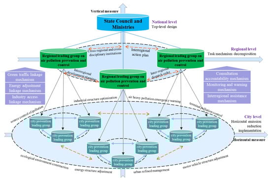 The atmosphere is a public resource that exhibits fluidity and infinity. Its state and composition are directly affected by natural geographical factors, such as solar radiation, temperature, humidity, air pressure, wind direction, precipitation, and other meteorological and topographical elements. The state and composition of the atmosphere are also indirectly affected by interactions between atmospheric particulate and pollution emissions resulting from human activity, such as the use of motor vehicles, industrial production, and coal burning. Based on the spatial and temporal attributes of pollution sources and pollution spread, the government also coordinates multiple levels of countries, urban agglomerations, cities, and enterprises and continuously adopts actions for the prevention and control of air pollution via direct and indirect governance. We summarize this action as the hierarchical cross-regional multi-directional linkage in terms of air pollution control models (Figure 1), which comprises the following framework and operational mechanism [].