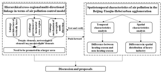 Air pollution has significant spatial and temporal differentiation in BTHUA. The fundamental reason is that its topography, industry, meteorology, and urban scale have significant spatial differentiation. The differentiation of time is reflected in the difference between heating season and non-heating season. The phenomenon of “scattering pollution” in Baoding and other cities is serious, and the amount of loose coal is large and the emission level is high. The differentiation of space is mainly determined by the spatial distribution of high-emission and high-pollution heavy industry. The total emissions and intensity are large with the steel, glass, petrochemical, chemical industry, and the supporting heavy transport vehicles in Tangshan, Tianjin, Shijiazhuang, Handan, and Xingtai. The main goal of the model governance is to prevent and control air pollution by adjusting the industrial structure, energy structure, transportation structure, land use structure, and emergency measures in BTHUA. However, topographical and meteorological elements are uncontrollable, and the government cannot regulate the flow of pollutants from outside the BTHUA into the area. Therefore, this model needs to be promoted in a larger area, even nationally and internationally. Based on the above analysis, this paper made the following logical framework diagram (Figure 3).