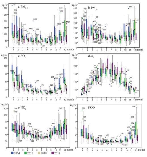 In terms of the monthly change trend, the concentrations of PM2.5, PM10, and SO2 kept a downward trend year by year from 2014 to 2017, and the prevention and control measures were significantly effective. The concentrations of NO2 and CO showed a trend of first rising and then decreasing, it is still necessary to further strengthen pollution prevention and control; the concentration of O3 kept increasing year by year on the whole. Therefore, it is necessary to attach great importance to O3 pollution and strictly implement an ultra-low emission policy []. Specifically, compared with the monthly pollutant concentration in 2014, the concentrations of PM2.5 and SO2 decreased significantly in all months in 2017, the concentrations of PM10 and CO increased only in January, and decreased significantly in other months; the concentration of NO2 increased in January, February, June, September, December, and decreased in other months; the concentration of O3 only decreased in October and increased significantly in other months.