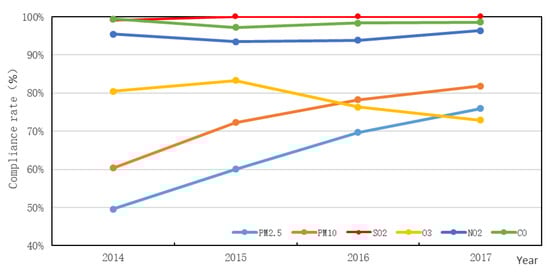 According to the requirements of GB 3095-2012, the 24 h average concentration limits of a second-class region for PM2.5, PM10, SO2, O3, NO2, and CO are 75 μg/m3, 150 μg/m3, 150 μg/m3, 160 μg/m3, 80 μg/m3, and 4 mg/m3, respectively. Excluding O3 and CO, the concentrations of the other air pollutants showed a significant growth in the rate of compliance in the BTHUA from 2014 to 2017 (Figure 5). The compliance rates of PM2.5, PM10, and SO2 continued to increase by 25.6%, 21.50%, 0.85%, respectively; PM2.5 increased from 49.58% to 75.98%; PM10 increased from 60.34% to 81.84%; SO2 increased from 99.15% to 100%. The compliance rate of NO2 first decreased and then increased, with an overall increase of 0.9%, 95.47% in 2014; 93.48% in 2015; and 96.37% in 2017. The compliance rate of CO also first declined and then rose, with an overall decline of 0.83%, 99.43% in 2014; 97.17% in 2015; and 98.60% in 2017. The compliance rate of O3 first increased and then decreased, with an overall decrease of 7.54%, 80.45% in 2014; 83.29% in 2015; and 72.91% in 2017.