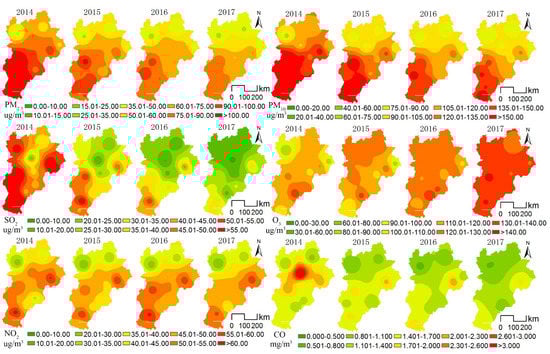 This section uses the kriging interpolation method to analyze the timing evolution and the spatial pattern characteristics of air pollution from 2014 to 2017 in BTHUA, respectively. The thorough comparison of 112 ground monitoring stations, primarily across the BTHUA, was conducted to evaluate the concentrations of the main atmospheric pollutants from 2014 to 2017.