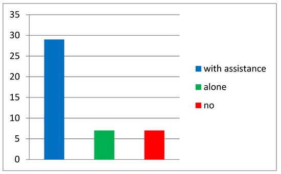 The number of participants who tried to perform the exercises by themselves was 8 (17.7%), 29 attempted the exercises with assistance (64.4%), while 8 (17.7%) did not perform the exercises (Figure 1).