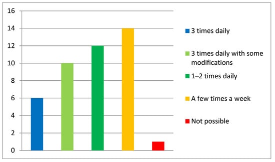 Most of the respondents (30 patients) declared the possibility of performing the exercises every day. Details of the frequency of the exercises are presented in Figure 2.
