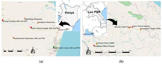 Study sites and health facility locations: (a) Kwale county in Kenya: Kwale District Hospital, Kinango Hospital, Diani Health Clinic, Mwaluphamba Dispensary, Mwachinga Dispensary, and Vyongwani Dispensary; (b) Savannakhet province in Lao PDR: Songhkone District Hospital, Lahanam Health Center, Xepon District Hospital, Dongsavanh Health Center, Manchy Health Center.