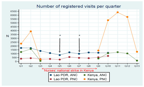 Numbers of registration at antenatal care (ANC) visits and postnatal care (PNC) visits per quarter in two study areas. In Lao PDR, there were delayed financial incentives in Q5 and Q7 (*). In Kenya, there was no registration process during Q4–Q8 because of the national nurses’ strike. Quarters in Kenya: from April 2017 (Q1) until April 2020 (Q13); those in Lao PDR: from August 2017 (Q1) until January 2020 (Q10).