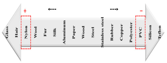 To generate frictional electricity, electrostatic force was created to reach the equilibrium of electric charge for each material [31]. Figure 1 orders various materials according to their electric charge. Following Ho and Cho (2018), PC and PVC friction plates were used to generate static electricity with a nylon brush filter [31].