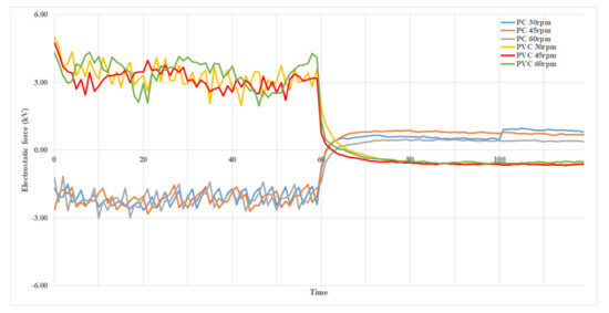 Average electrostatic force (kV) generated by PC and PVC at different filter rotation speeds.